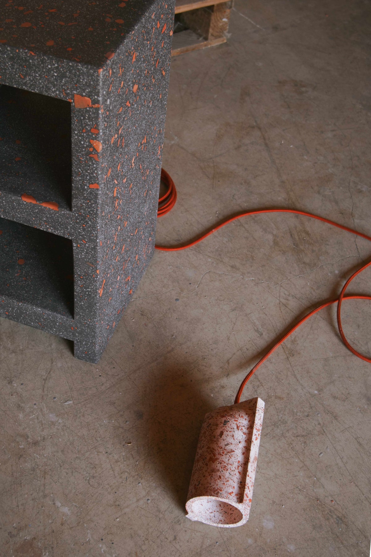 WAYST is Chelsea and Andrew's ongoing exploration of circular design — reimagining construction waste as design material. Brick rubble, terrazzo offcuts and other discarded fragments are cast into lights, tabletops and objects with new life.
